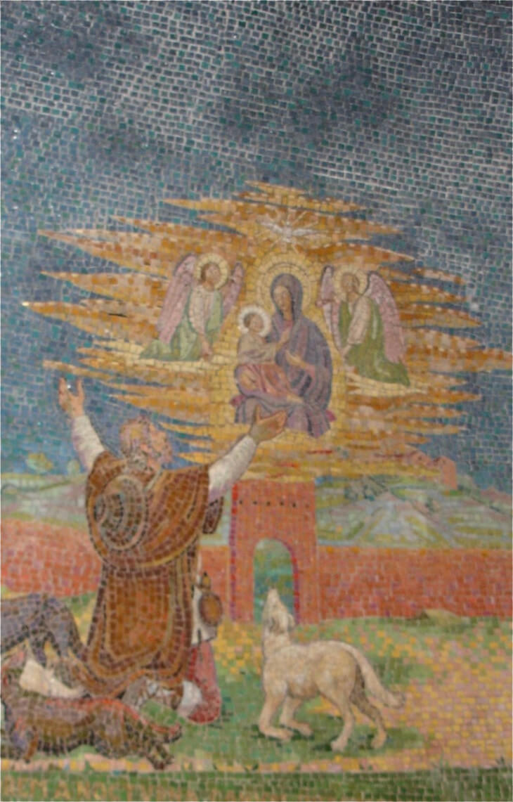 1740年,一位迷路的朝聖者被一群兇猛的野狗追趕,他拔腿狂奔,來到萊瓦城堡塔,猛一抬頭,看到城牆上面一幅馬賽克貼的「聖母抱聖嬰耶穌像」,馬上跪下,祈求聖母保護他免被野狗侵襲。說也奇怪,那群野狗竟然都站住不動,然後轉身夾著尾巴一隻一隻的離開。